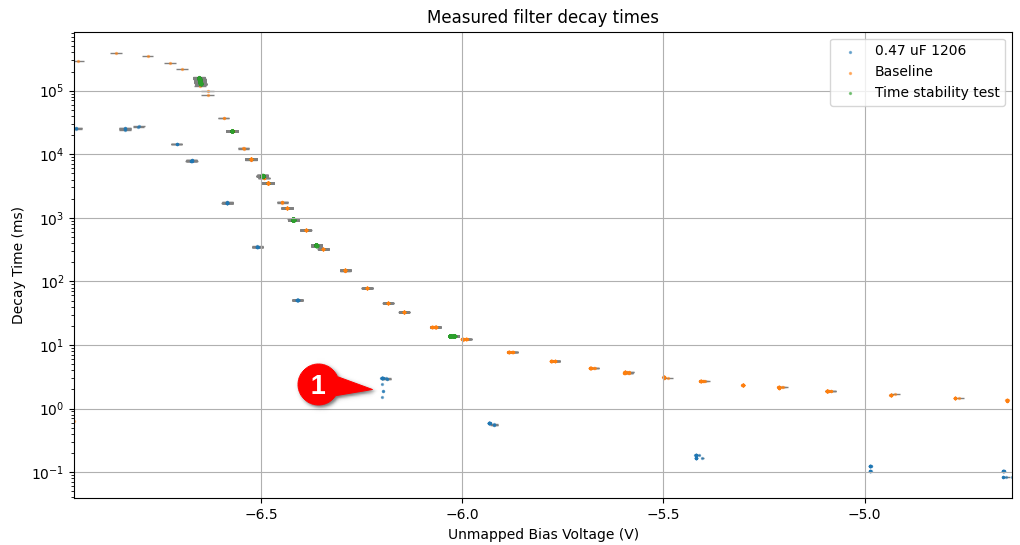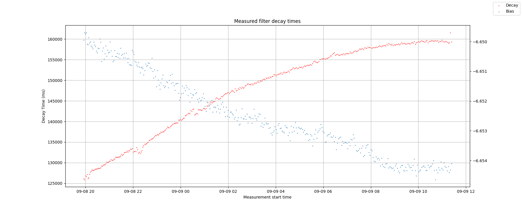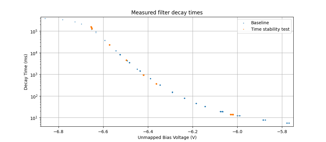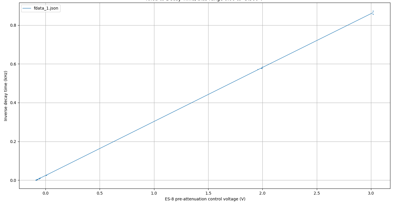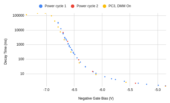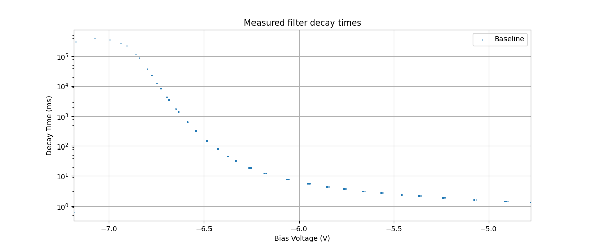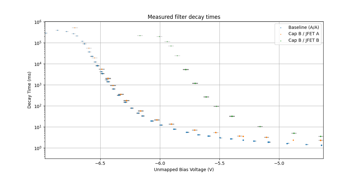 I'm not sure what accounts for the splitting at the upper decay times. I may have power-cycled the rack somewhere in there. It's also possible that I need longer holdoff times when measuring longer decay so that the measurements are more independent. Given the limitations of my DMM resolution, I'd expect some noise at higher decay times, but I would still expect to see monotonic data.