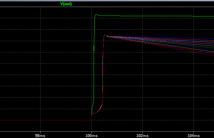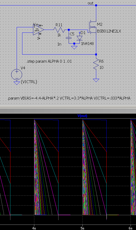 Note that in the above simulations, the control voltage ranges from 0 to 100 mV, or 0 to 20 mA through the 5 ohm sense resistor.