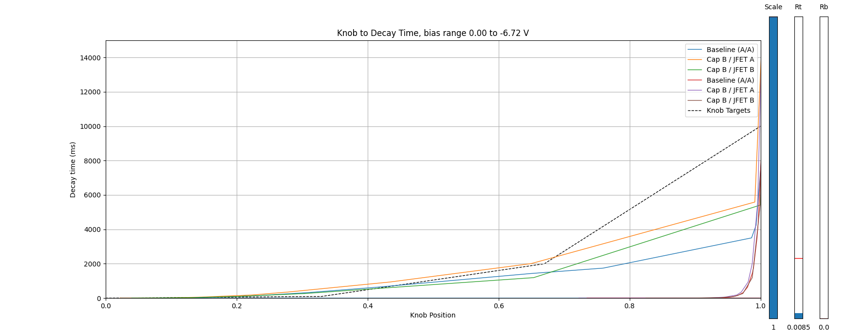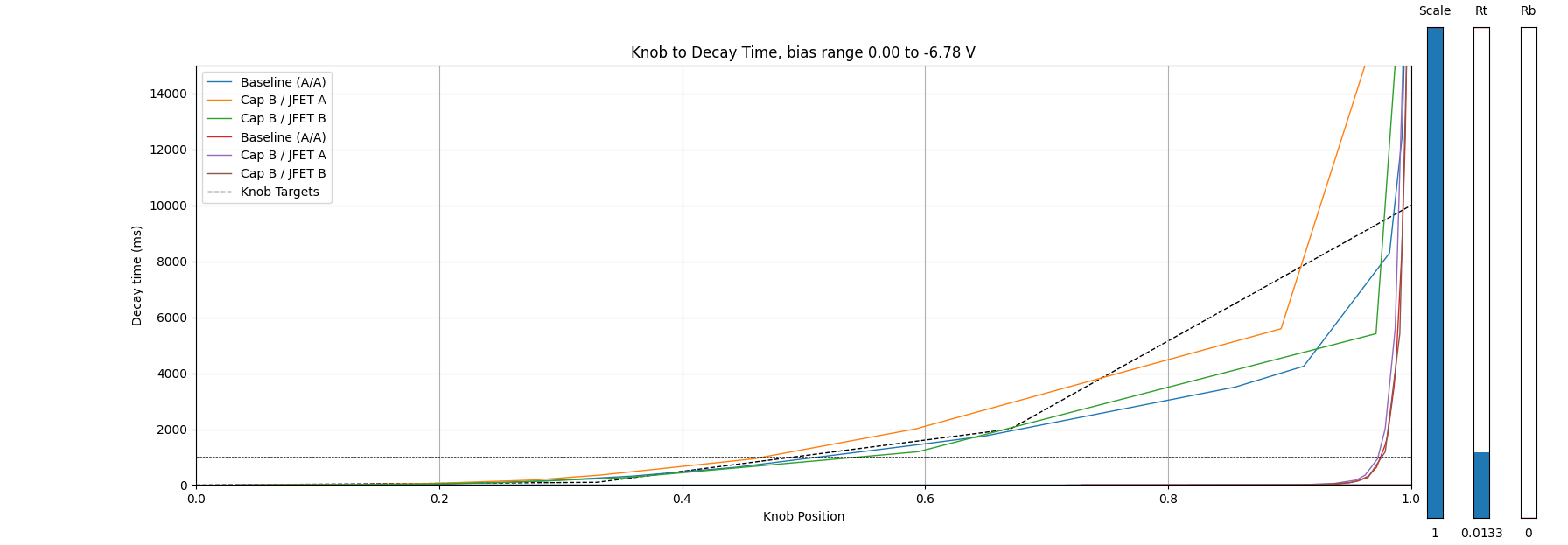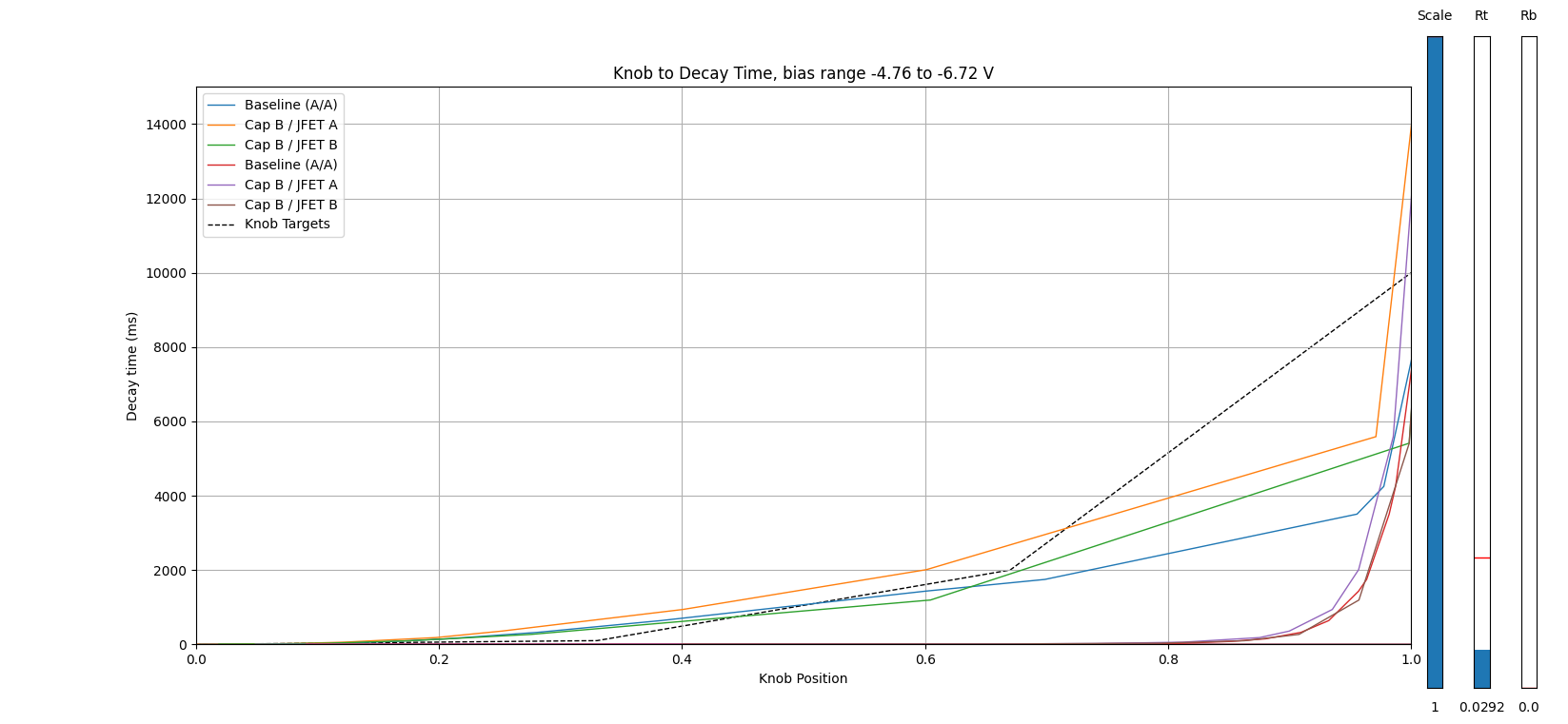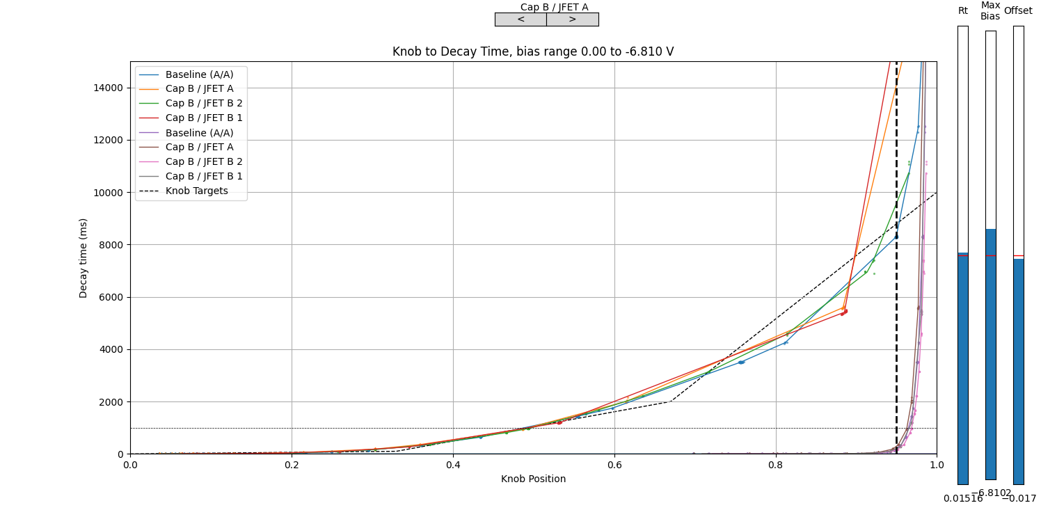 Given suitable values of bias gain and knob curving resistance (Rt), it may be possible to calibrate the decay knob by adjusting only the bias voltage offset. In the below plot, all 4 data sets have the same Rt and Max Bias, but have been tuned to different offset values. The 'Cap B / JFET B 2' dataset was taken today and separated from the original dataset since the two didn't seem to match well. I'm not sure what caused the change, but I would guess a thermal effect on the JFET threshold voltage or some other parameter.