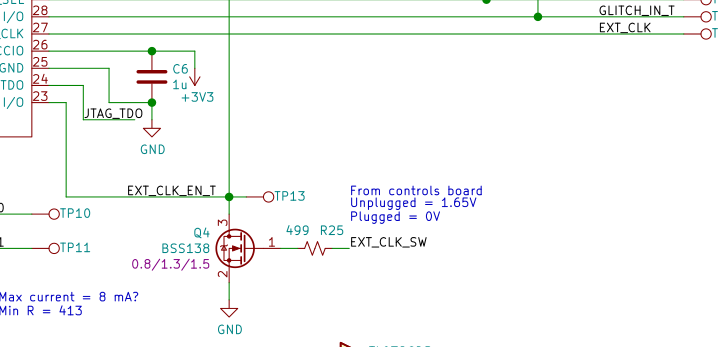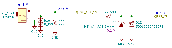 In the rev 00 design, the switch pin was biased at -2.16 V, and so could briefly place that voltage on any connection before breaking the switch. The high bias resistances made that unlikely to be a significant issue, but I'm aware that other designs have had issues with this approach in the past (albeit without the high impedance between the bias and the switch pin). In the original implementation, it was intended that a PFET would be switch on when the switch pin and signal pin were connected due to the negative bias voltage. When the two were disonnected and a clock signal driven on the clock pin, it was expected to put >= 0 VGS on the PFET, causing it to switch off and toggle a clock select select multiplexer. In practice, I saw the external clock duplicated on the clock select signal.