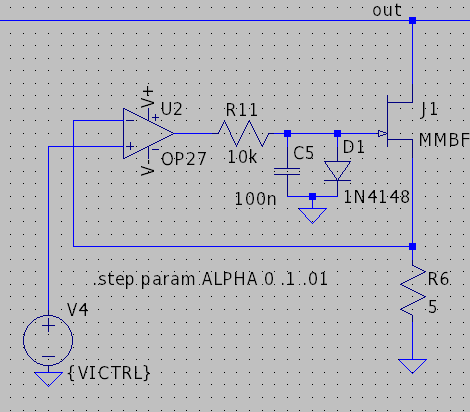 - When the filter output drops to 0, there will be no current through the JFET, and the op-amp will drive the gate voltage as high as possible to try to compensate.