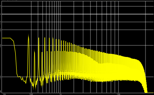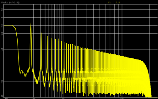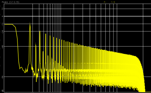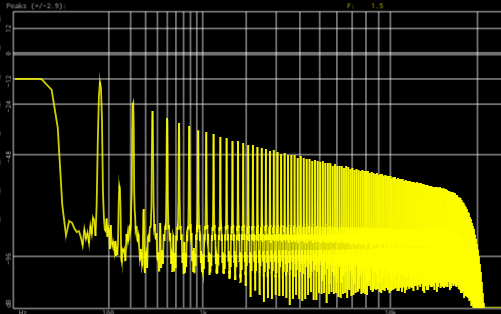 As for audio-rate filtering, the range that produces audible variation is pretty narrow - maybe the first 5% of the knob. There is some visually-interesting variation in the harmonic content of the waveform due to the asymmetry introduced by the filter. The below spectra are a C2 with a sequence length of 2 (i.e. a square wave with 50% duty cycle as input).