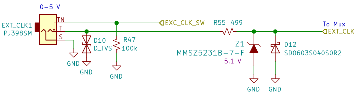 Regardless, that is not what I did. At all. Also I would like to call attention to the current over-voltage protection scheme, which uses a zener diode to clamp the clock input to 5.1 V. The rev00 design used a 5V-tolerance multiplexer, and the rev01 design uses a 5V-tolerant CPLD, so this is technically legal. I'm pretty sure I could just drop down another NFET and get rid of the two protection diodes, though, reducing BOM complexity, simplifying the CIB, and providing more elegant protection. The main drawback is that an open-drain clock is limited by the trade off between current consumption and switching speed. For audio frequencies, this is no problem at all. It might start to become more of an issue in the 10's of MHz, though, which could limit, for example, video synthesis applications. That's not really a requirement of the design, though. I think the issue could be resolved by BOM replacements (smaller pullup resistor and maybe a different NFET with a lower threshold voltage), which could be necessary anyway to increase filter cutoff frequencies and use faster op-amps on the output (assuming a pin-compatible solution exists. As I said, video compatibility is not a Requirement).