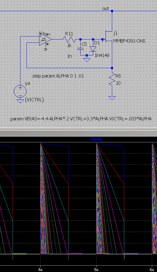 - When the next edge arrives, the JFET will be sitting at its lowest possible rds until the op-amp has time to slew all the way from its maximum output voltage down to the appropriate negative gate bias voltage.