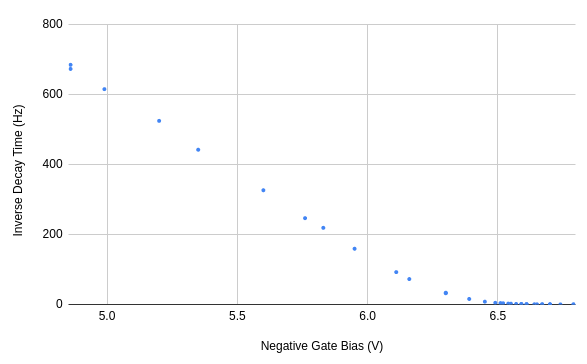 There is a pretty obvious linear relationship between the inverse of the decay time and the gate bias down to 50 Hz or so.