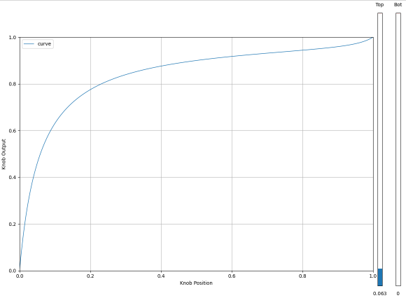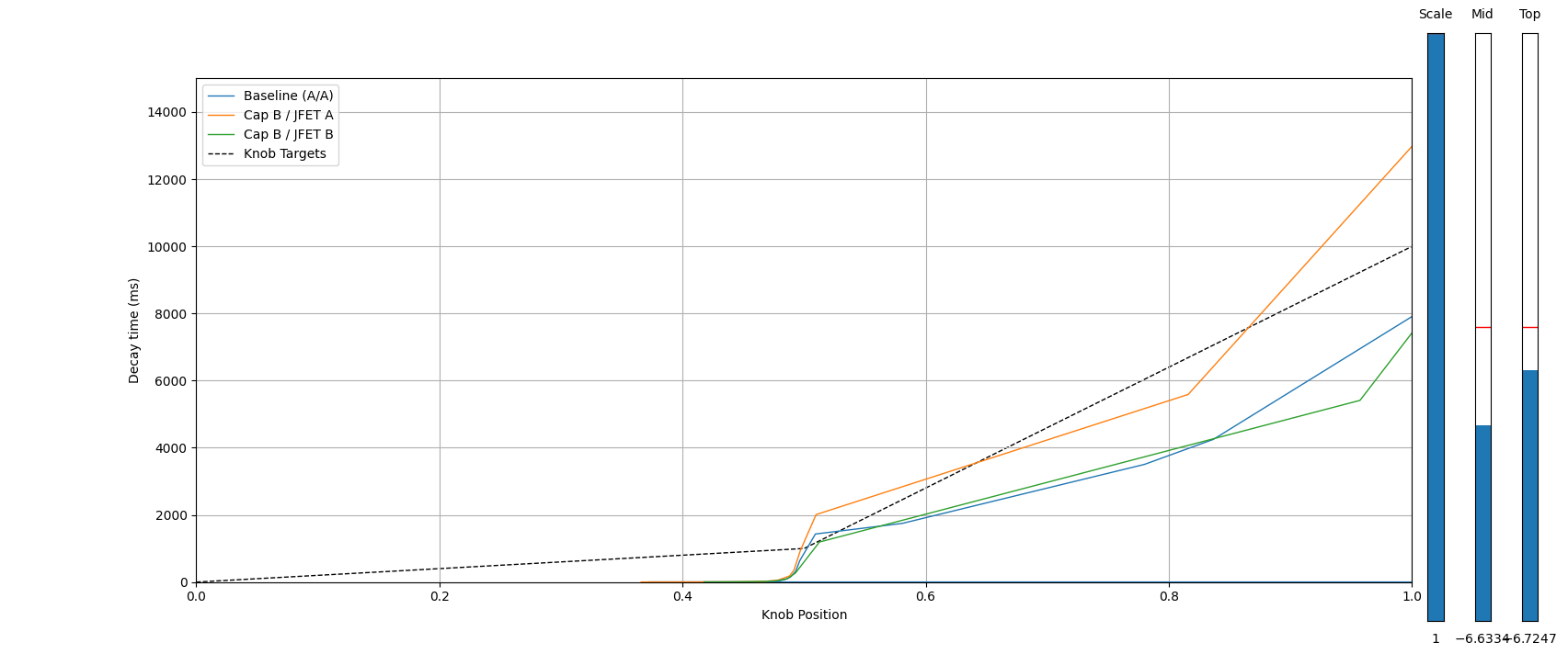 - The knob voltage doesn't get very close to 0 over most of its range, which could limit the maximum achievable decay time in the useful tuning range