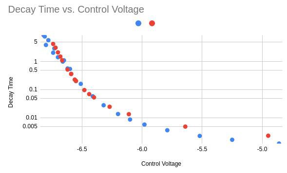 After those two updates, I'll do a quick test to determine the bounds of the control voltage that produce useful behavior and see about modifying the scaling circuit to give me a little better sensitivity on the knob. Ultimately, I want to allow the control voltage to go all the way to 0 in order to give access to audio-frequency filtering behavior, but for the purposes of characterization, I don't think I need to go that low, so it's worth considering a scaling circuit that gives me cutoff as high as, say, 400 Hz and as decay times as long as, say 5 seconds.