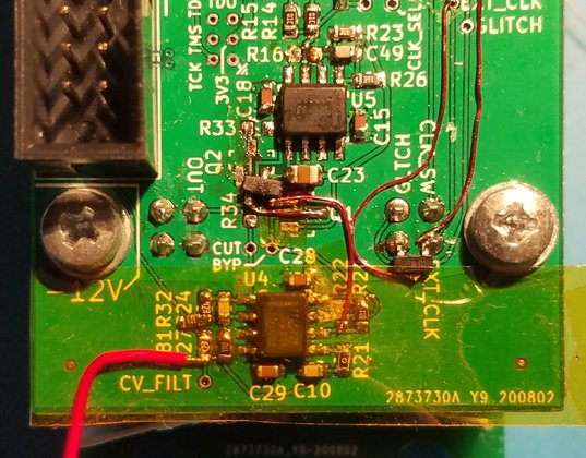I suppose the next thing I might try is removing R16 to make the op-amp act as a buffer, lowering the peak output voltage to 1.65 V. When I look at the filter output, I need a knee somewhere around 2 V (though this varies with cutoff configuration). The rev00 seems to have a similar knee, though it's near the peak of the waveform and less pronounced.
