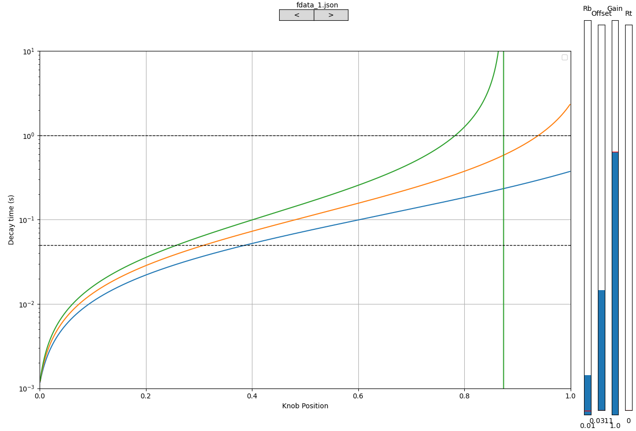 The above plots also include the decay times with the current uncurved knob implementation (in red, purple, and brown).