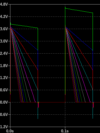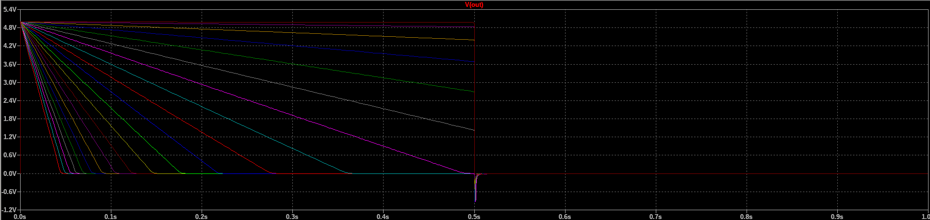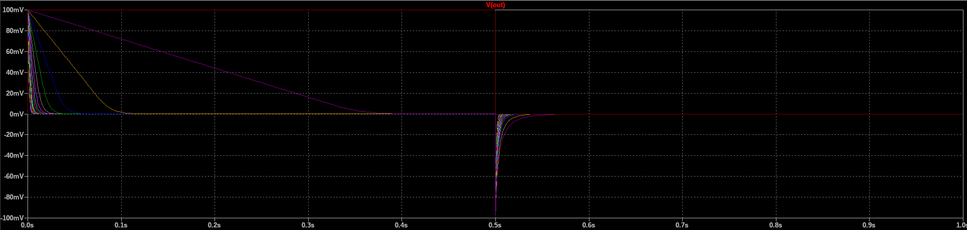 This approach produces a maximum decay time at 0 V control voltage, and in simulation this corresponds to about 2 seconds, which is quite a bit short than I can achieve right now. The maximum decay time can be extended some by increasing the sense resistances, though this also reduces the maximum current that can be drawn from the capacitor and therefore increases the minimum decay time.