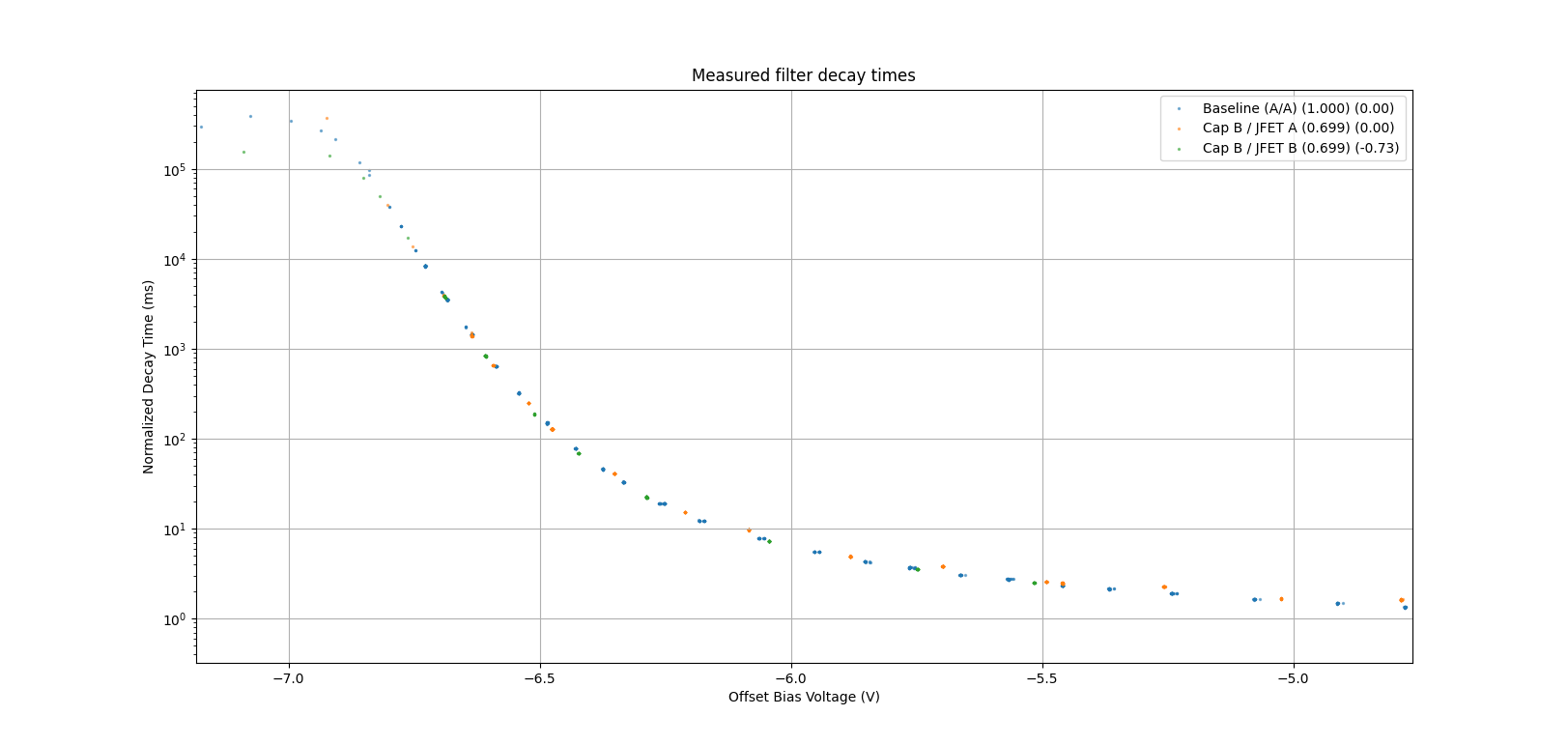 The B/A and B/B 1 curves both lack data around 10 s decay time, so I guessed at thir calibration based on the other curves and the 1 second decay time crossing. The baseline Rt and Max Bias values were selected for the Baseline curve with no bias offset. Offset voltages ranged from -17 mV to +20 mV, although the JFET B curves also include an additional 730 mV offset.
