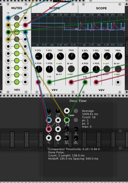 In order to do so, I need a means of measuring the output pulse duration. My old analog scope isn't really suitable for measuring long pulses, which is the data I'm really interested in. That said, I can make the nysthi expired time module in VCV work along with a comparator and a couple edge detectors. Since I'm concerned with long pulse widths, this should be fine.