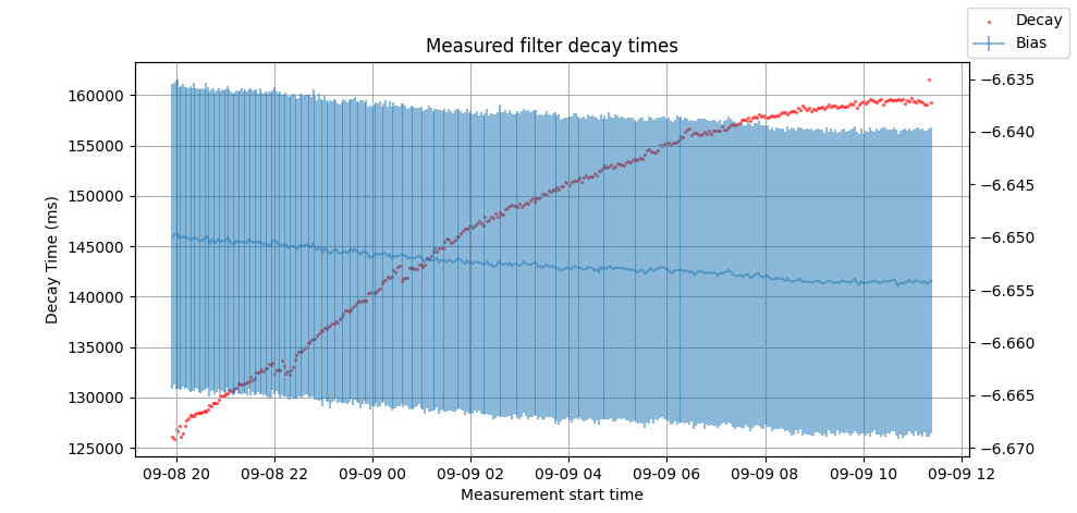 At decay times in excess of 2 s, I'm observing some really dramatic variation. It typically seems consistent over short time spans, but seems to sometimes change quickly to a new duration. I'm not sure if the stepped behavior I'm noticing is real or imagined, though. Right now I'm looking at a test that was sitting around 7-8 s for 10 trials or so, and now seems to be at about 14 s. I don't really have sufficiently granular data collection to say more at this point. I may want to update the measurement module to save individual trials and produce json output on demand.