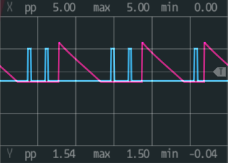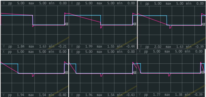 Short decay times were instead measured by driving the module with an LFO and visually aligning the compator gate output with the negative edge of the filtered signal. When the two were aligned, a single period of the LFO corresponded to the duration of the comparator output, and could be used to compute the decay time.