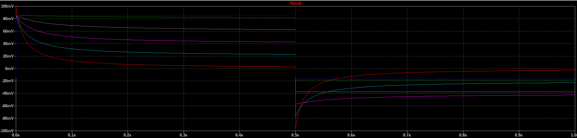 In the perfect world of the simulation, using the buffer to provide the bias feedback drops the 3 dB cuttoff with knob at 28% from about 6.5 Hz to about 4.5 mHz, and at this point I have to assume there are leakages not being simulated. It almost seems like it's not decaying to 0, though, which would be a concern for trying to use it as an envelope. The main part of the transient is still pretty short, dropping from 1.65 to 0.6 V in 0.1 s, but then over the next 0.9 s it only drops another 0.1 V.