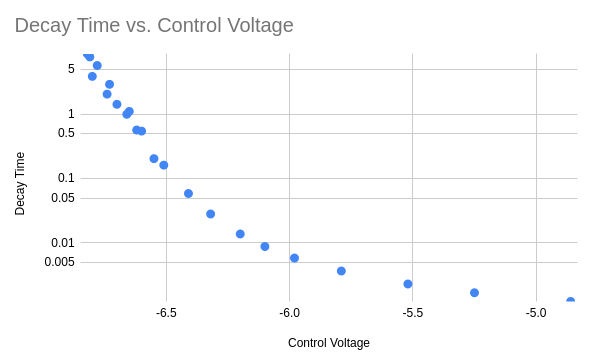The range of audio-frequency cutoffs (<20 ms decay time) is almost non-existent, though, falling somewhere in the last 5-10 % of the knob. I may be able to afford a less drastic curve to gain more access to the audio range of cutoff frequencies while losing the more extreme decay times. The 1-second decay mark will shift even further left on the knob, but as long as it's still accessible I think that's probably fine.