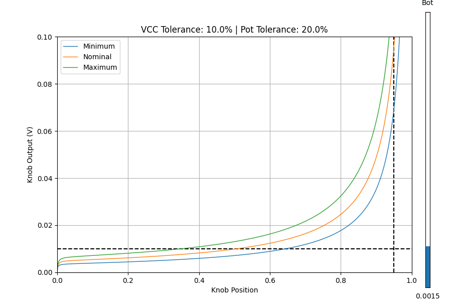 One drawback of this method is that there isn't really a simple calibration procedure. There are three tuning points: the bias offset, the max decay bias, and the knob curve resistor. In simulation, I've already tuned the bias offset based on my measurement data, and once its set it shouldn't really need to change. The other two parameters affect both the minimum and midpoint decay times and so can't be tuned independently. It'll have to be an iterative process. In production it may be possible to take test data and use it to generate calibration parameters. The maximum voltage generated by the knob depends on the microcontroller's 3.3 V supply, and so will be subject to some variation. Also, the knob switches over to DC coupling at the last 5% or so, and the knob's divider ration at 95% depends on its curve.