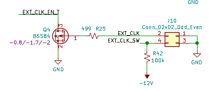 In the rev01 I intended to use a simpler design with the clock switch pin normally biased at 0 V. The idea was that the switch signal pin would be pulled to 3.3 V, and the switch pin pulled to -12 V with resistors selected to provide a 0 V bias point. When the two were disconnected, the switch pin would be pulled to -12 V, switching a PFET on later down the line. Meanwhile, the clock pin would be pulled to 3.3 V, allowing operating with an open-drain clock as well as a push-pull clock. Here's what I actually did